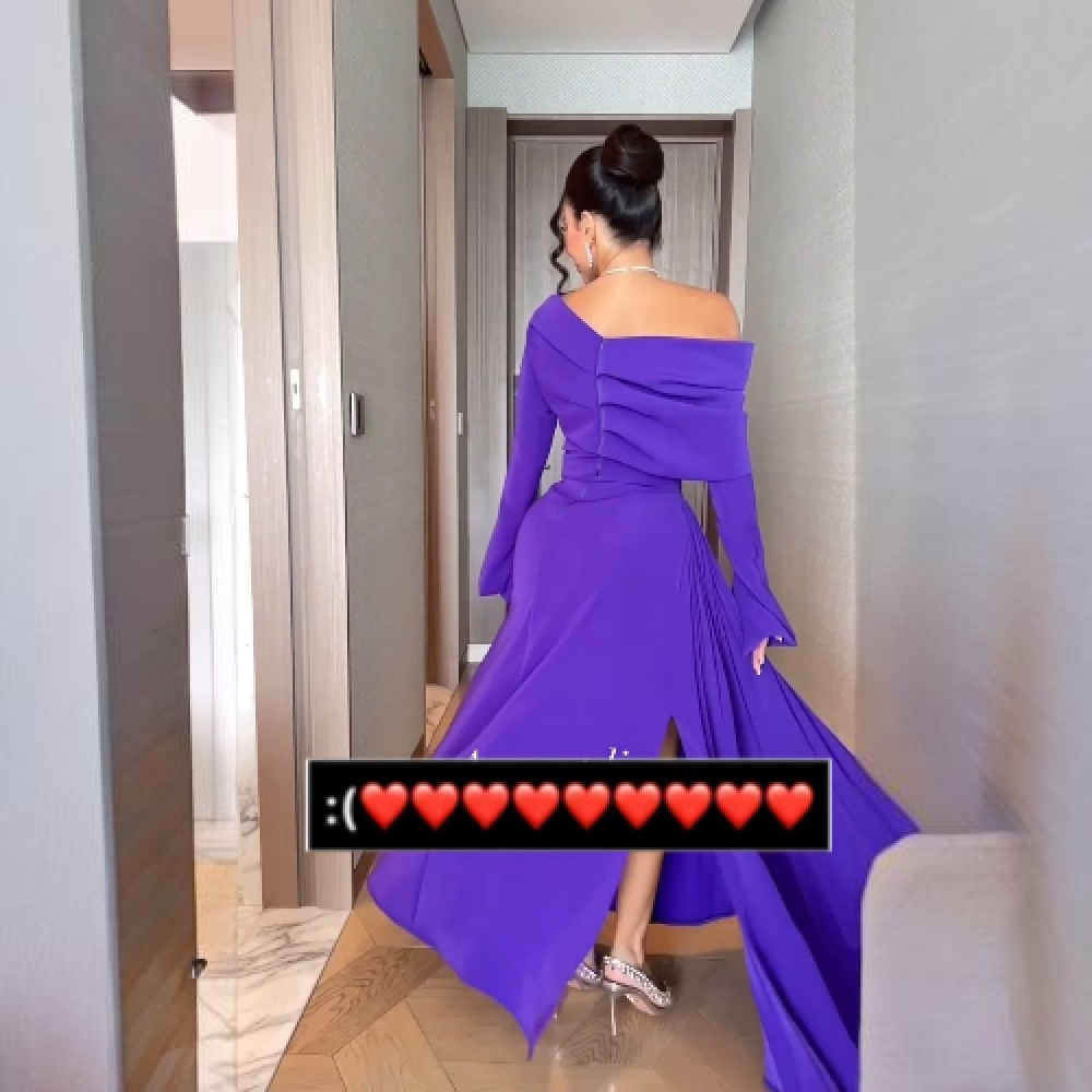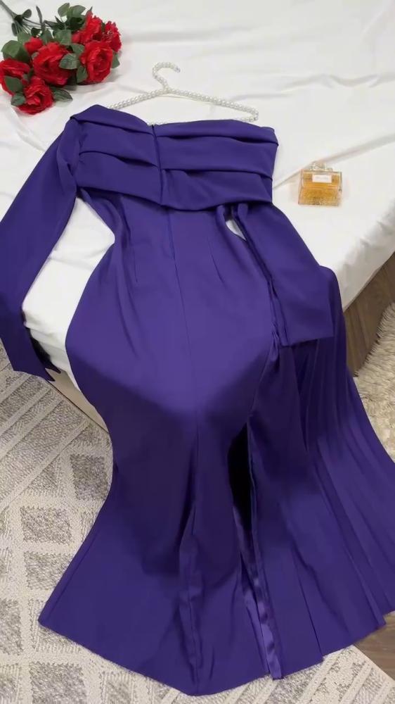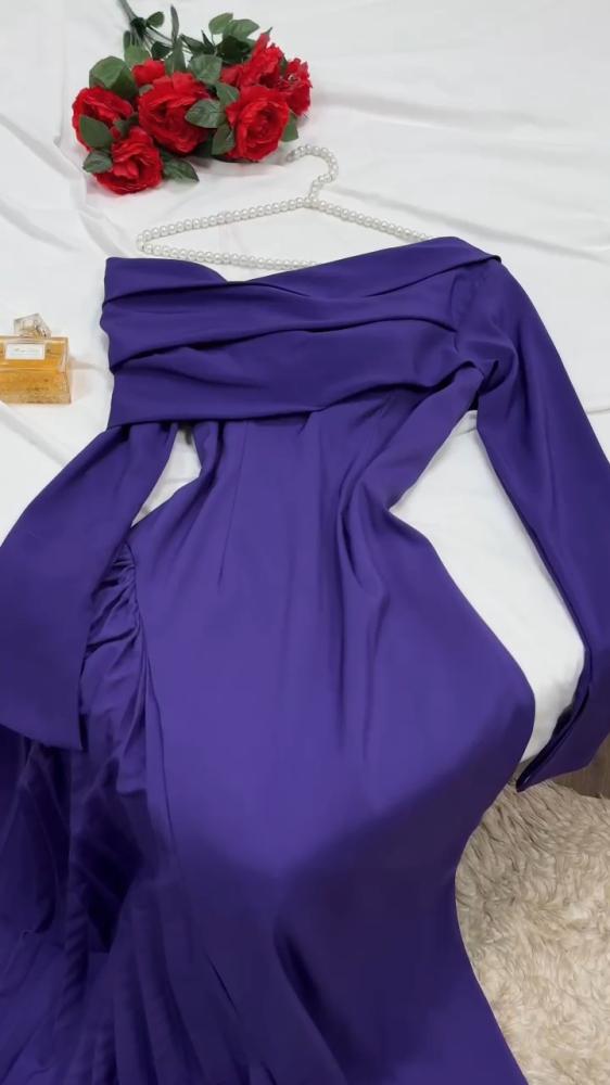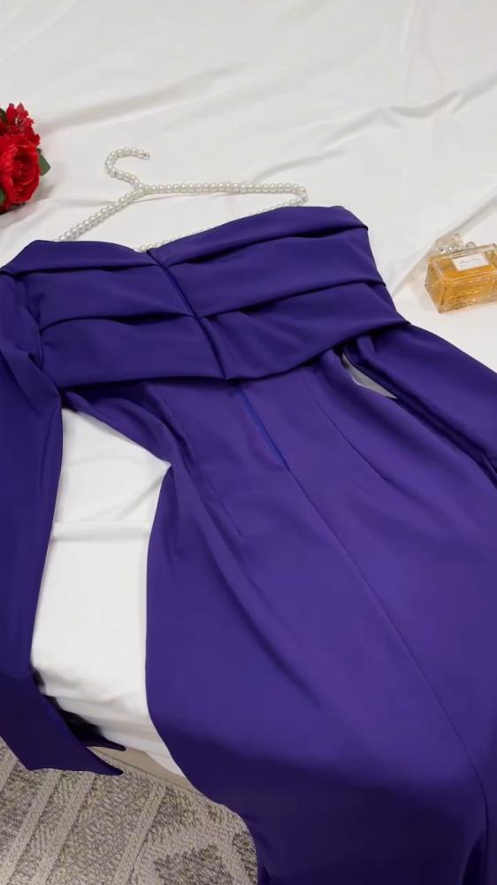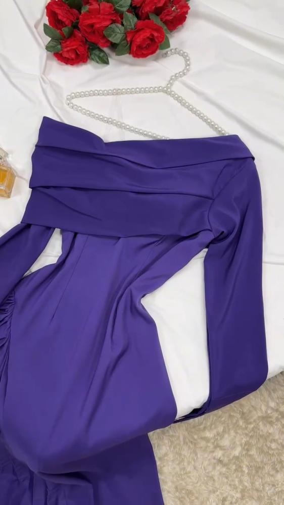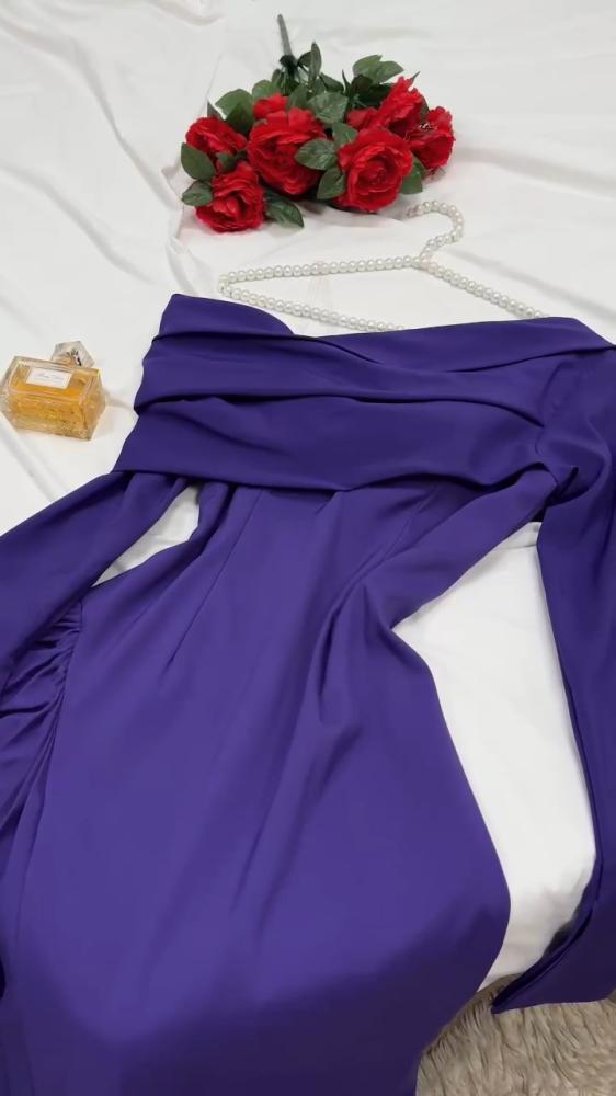 يتميز الفستان المصنوع من قماش التفتة باللون البنفسجي بقصة عصرية تجمع بين الأناقة والجرأة.