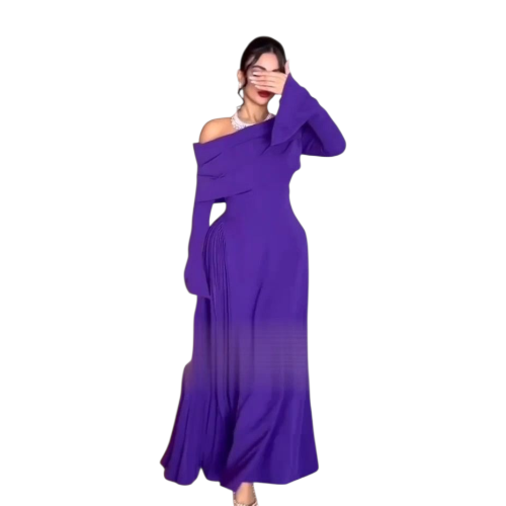 يتميز الفستان بتصميم فريد بكتف واحد مكشوف، مع طيات قماش أنيقة تنسدل من الكتف وتلتف حول الصدر. يبرز التصميم القوام بقصة ضيقة عند الخصر، بينما تنسدل كسرات ناعمة من الجانب الأيسر لتضيف لمسة جمالية. الكم الأيسر طويل وواسع عند المعصم، مما يضفي لمسة درامية على الإطلالة.