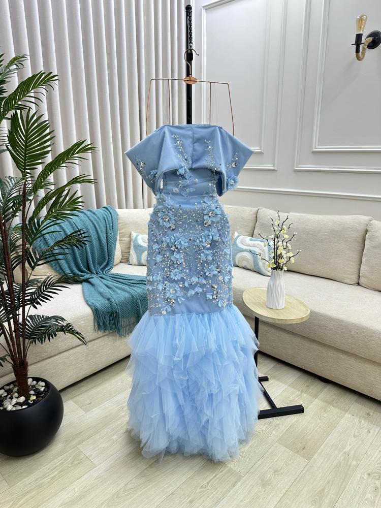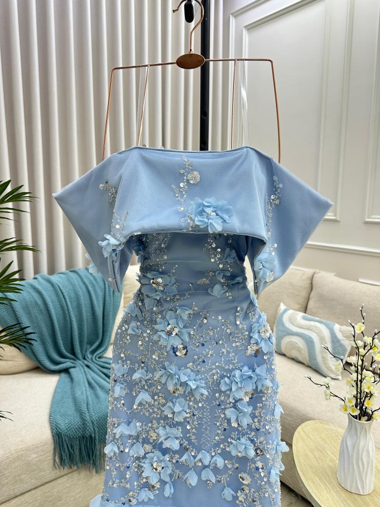 الفستان يتميز بلون أزرق فاتح جميل وهادئ، ويجمع بين الأناقة والفخامة. الجزء العلوي من الفستان مصمم بطريقة مبتكرة تشبه الكاب أو الوشاح القصير الذي يغطي الأكتاف والجزء العلوي من الصدر، وهو مزين بتطريزات ثلاثية الأبعاد على شكل أزهار صغيرة بنفس اللون أو بألوان قريبة، بالإضافة إلى بعض اللمعان من الخرز أو الترتر.