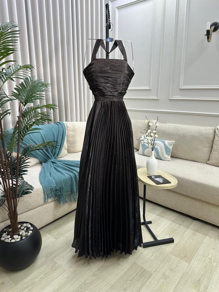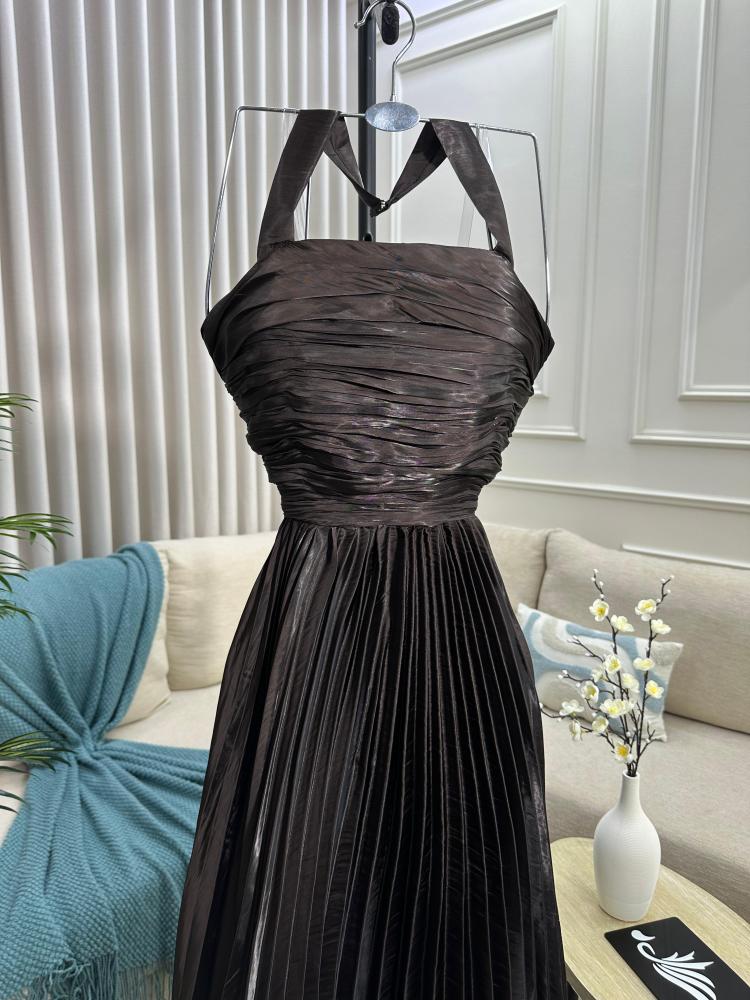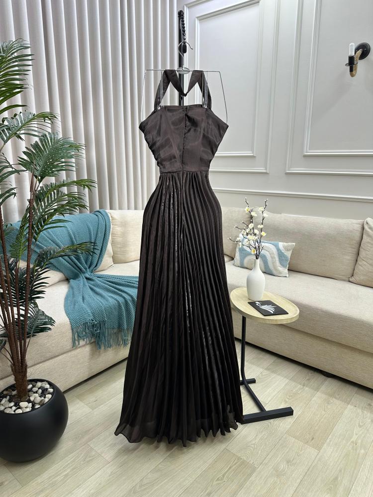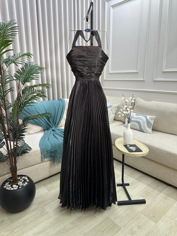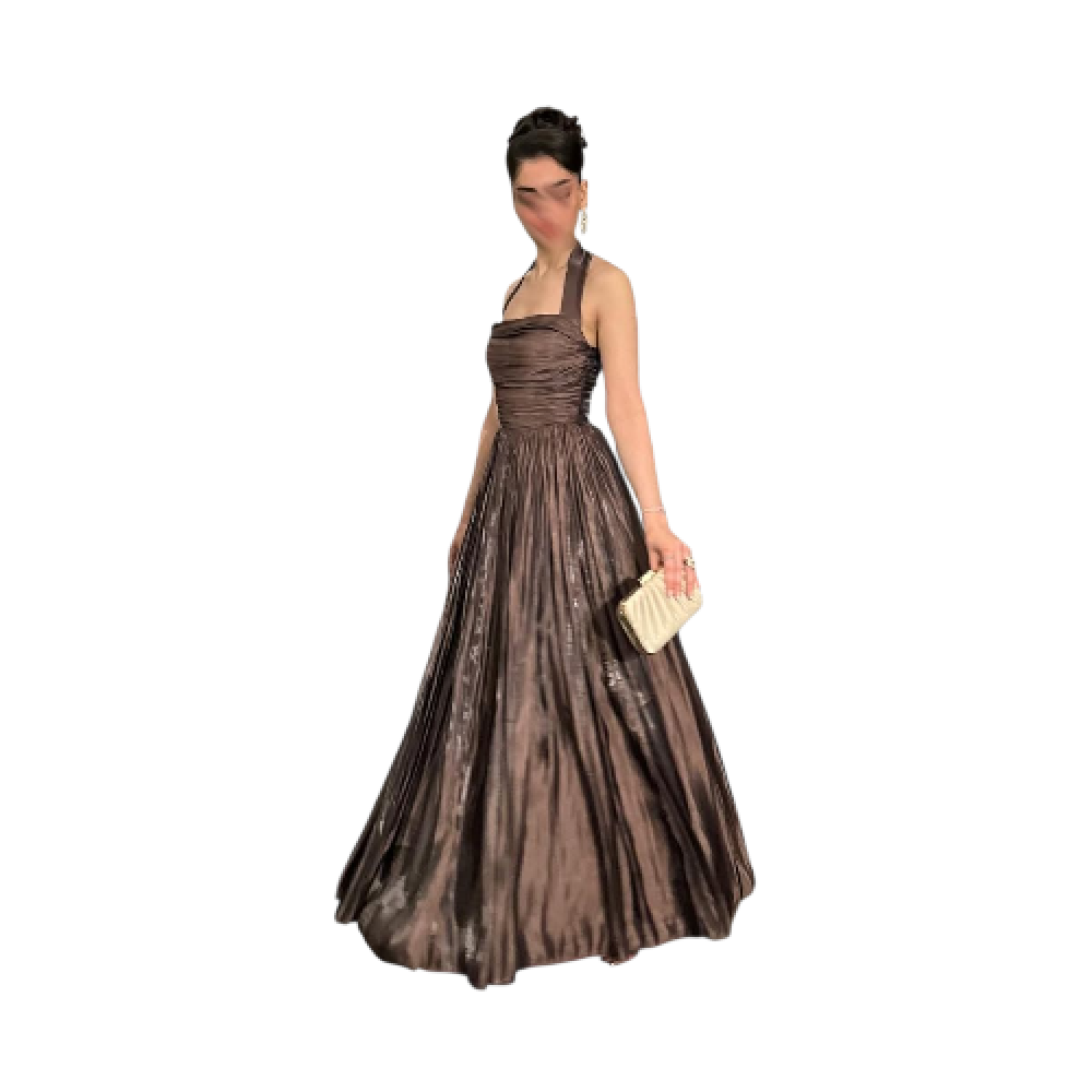 فستان سهرة طويل وأنيق بلون بني لامع (قد يميل إلى البرونزي الداكن) يتسم بـ قَصَّة الياقة المربوطة حول الرقبة (Halter Neck) التي تبرز الكتفين.
