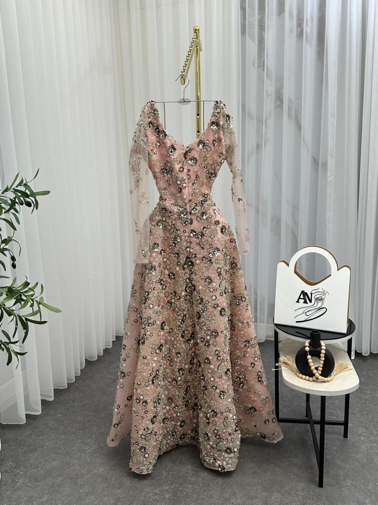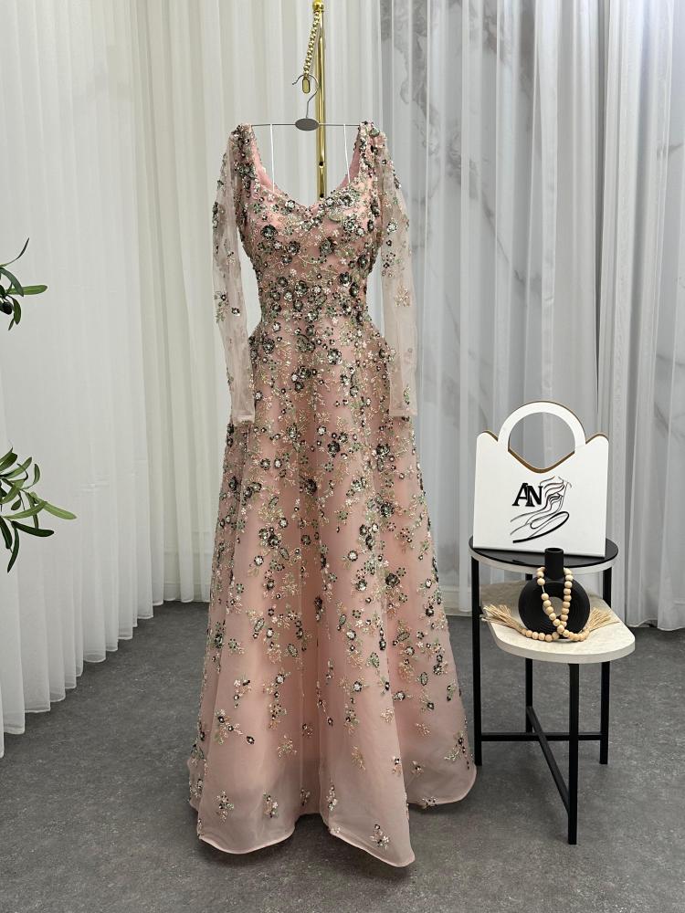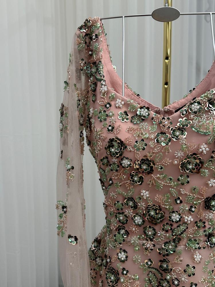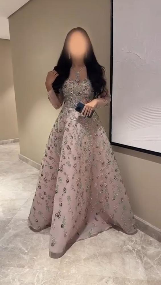 الفستان طويل وفضفاض، ينسدل بتصميم "A-line" . لونه وردي فاتح أو بيج مائل للوردي، وهو مزين بشكل كثيف بتطريزات أو ترصيعات لامعة باللون الفضي أو البيج الفضي، والتي تنتشر على كامل الفستان، مما يعطيه بريقًا وتألقًا.