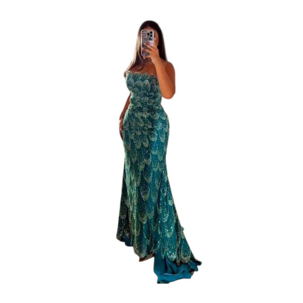الفستان طويل وله قصة حورية البحر (mermaid cut) أو السمكة، ضيق عند الصدر والخصر والأرداف ثم يتسع بدءًا من الركبتين ليشكل ذيلًا. الفستان بدون حمالات (strapless) ويبرز الجزء العلوي من الجسم والكتفين. لونه زمردي أو أخضر بحري عميق. يغطيه تطريز كثيف بالترتر اللامع أو الخرز بلمعة ذهبية أو فاتحة، مما يمنحه مظهرًا فاخرًا وبراقًا. تصميم التطريز يأخذ شكل زخارف متداخلة ومنحنية تشبه حراشف السمك أو ريش الطاووس، وتغطي كامل الفستان من الأعلى إلى الأسفل. القماش الأساسي قماش سهرة ثقيل ومبطن بتفته استرتش ليحافظ على شكل الفستان وقصته. الذيل القماشي السفلي مصنوعًا من قماش تفته سادة لامع بنفس اللون الأخضر الزمردي الفستان مخصص للسهرات والمناسبات الرسمية الكبرى.