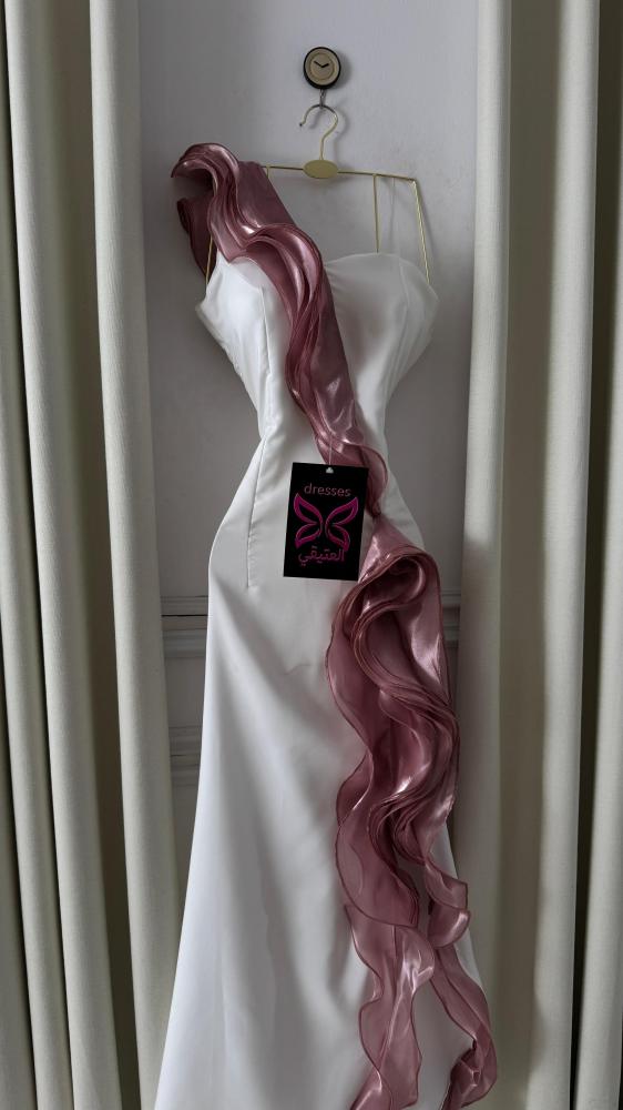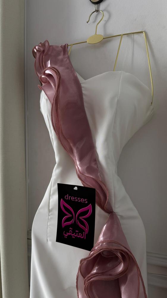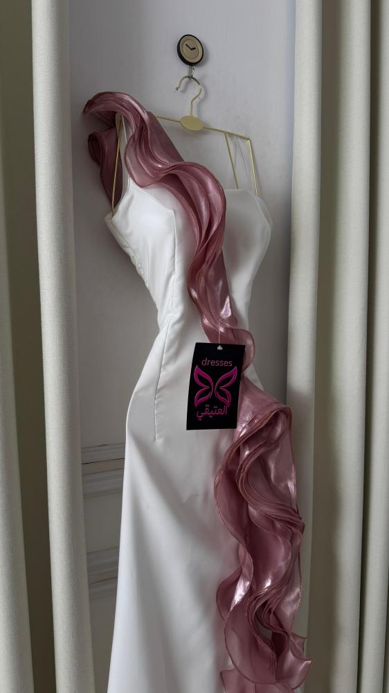 يأتي الفستان بكتف واحد (One Shoulder) مع حزام من الكشكشة (Ruffle) الضخمة المصنوعة من الجازار اللامع باللون الوردي الناعم (Blush Pink).
