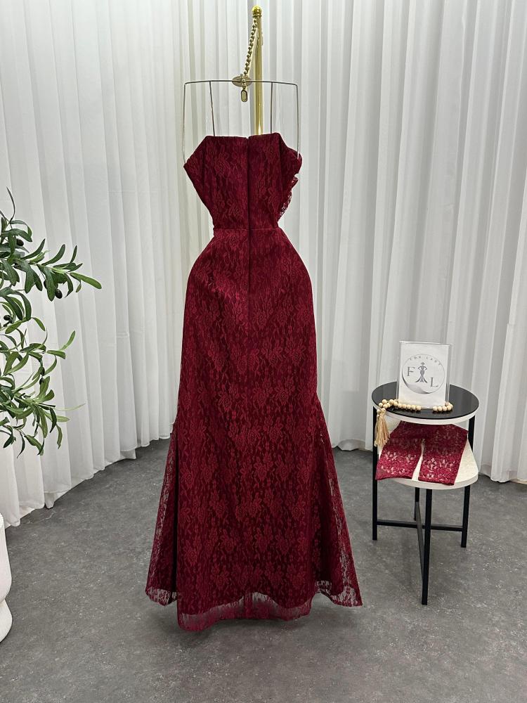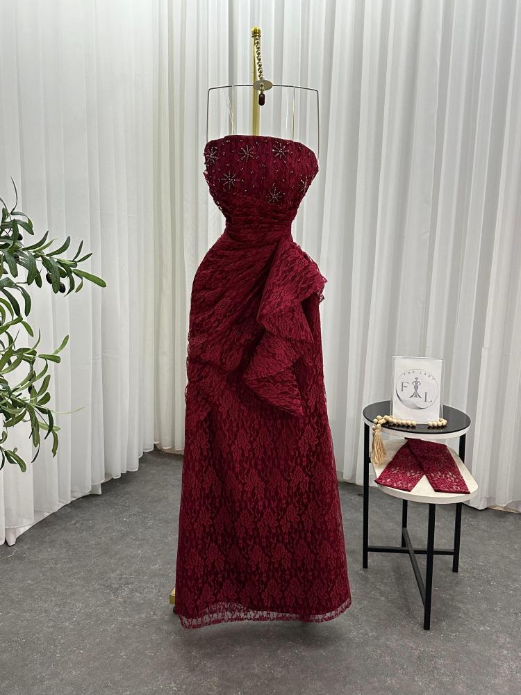 الفستان هو قطعة أنيقة ومفصّلة بشكل دقيق، مصنوع بالكامل من قماش الدانتيل بلون عنابي داكن. يتميز بتصميم طويل يصل إلى الأرض مع قصة "سترابلس" (بدون أكتاف) عند الصدر.