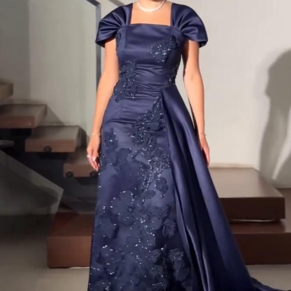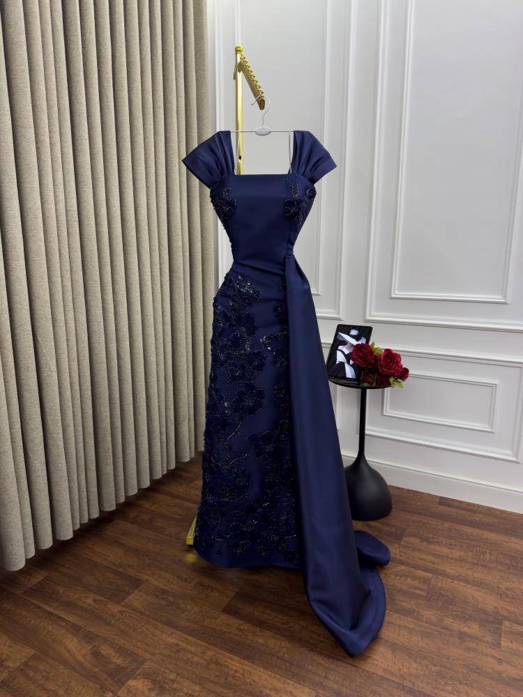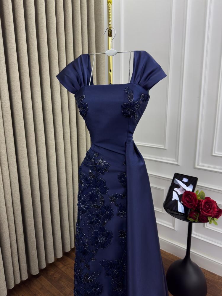 الفستان طويل ذو لون كحلي داكن أو أزرق نيلي عميق، ويبدو أنه مصنوع من قماش ميكادو، مما يعطيه مظهرًا أنيقًا وانسيابيًا.