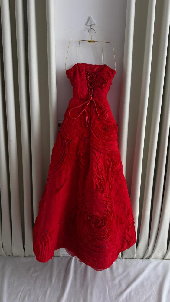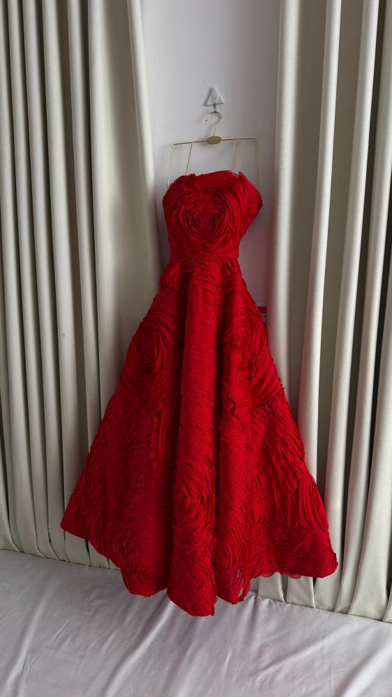 السمة الأبرز في الفستان هي الخامة والتفاصيل ثلاثية الأبعاد، حيث أن الخامة المستخدمة هي قماش التفتا تم تشكيله بالكامل على هيئة تطبيقات أو كشكشة مجسّمة شبيهة بالورود أو الأمواج الدائرية تغطي الفستان بالكامل، من الصدر حتى الحافة السفلية. هذا النسيج المعالج يعطي مظهراً غنياً بالتعقيد والحجم.