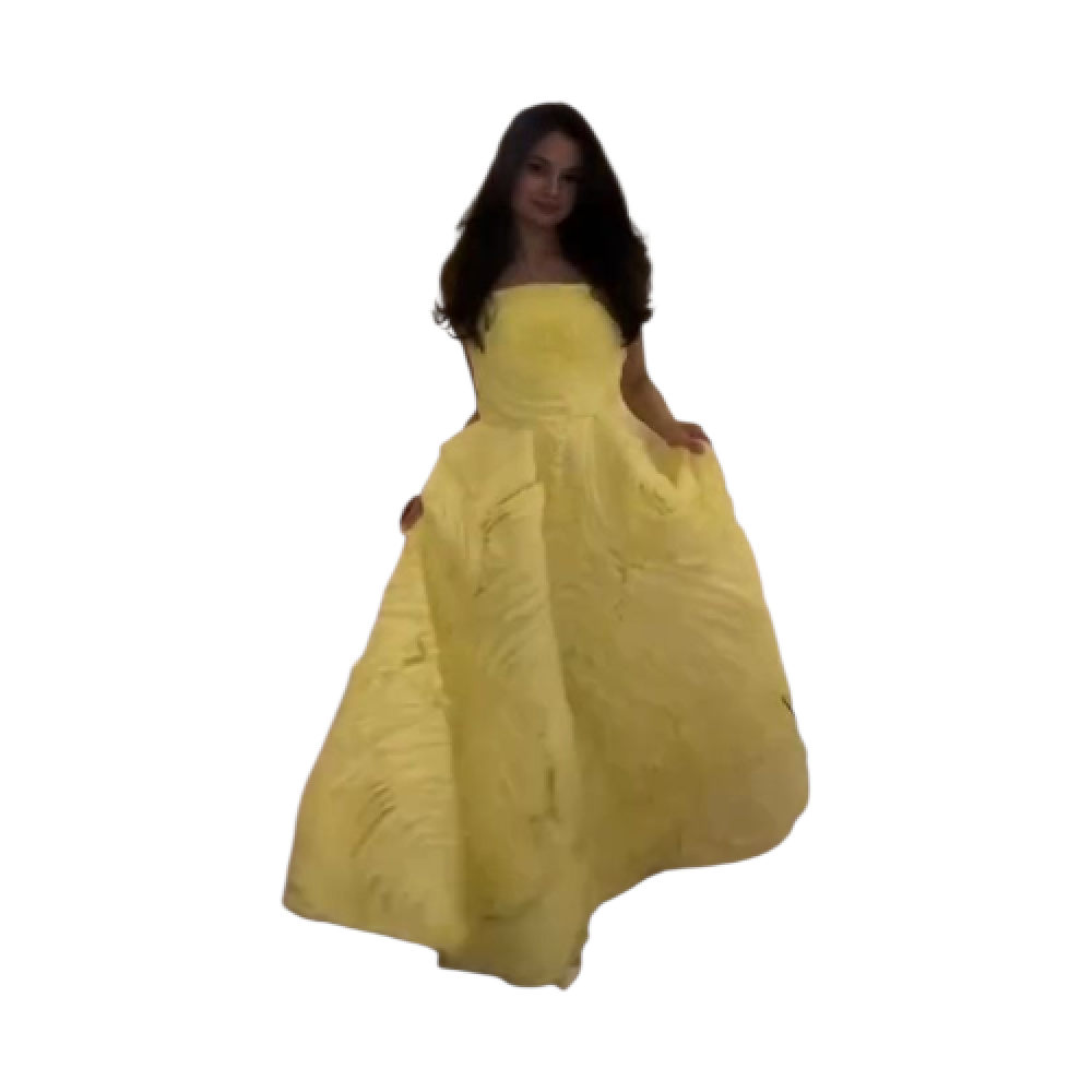 فستان سهرة طويل بلون أصفر فاتح وحيوي.