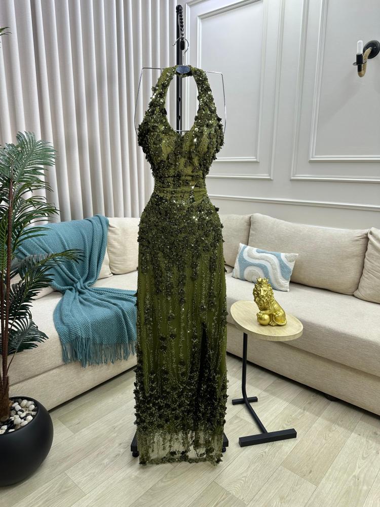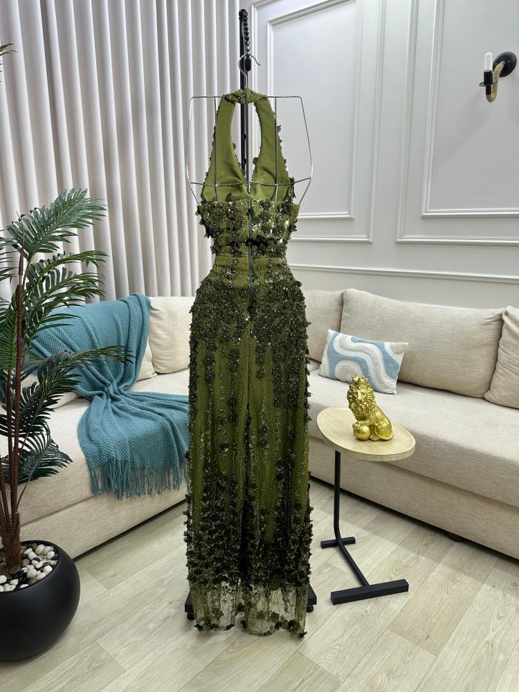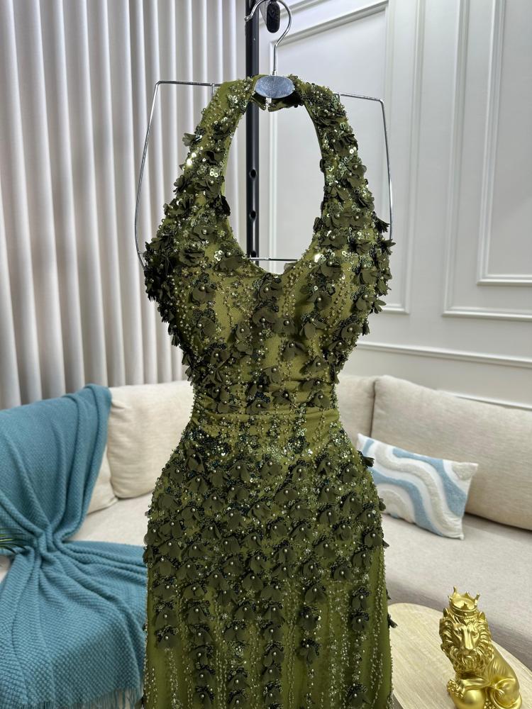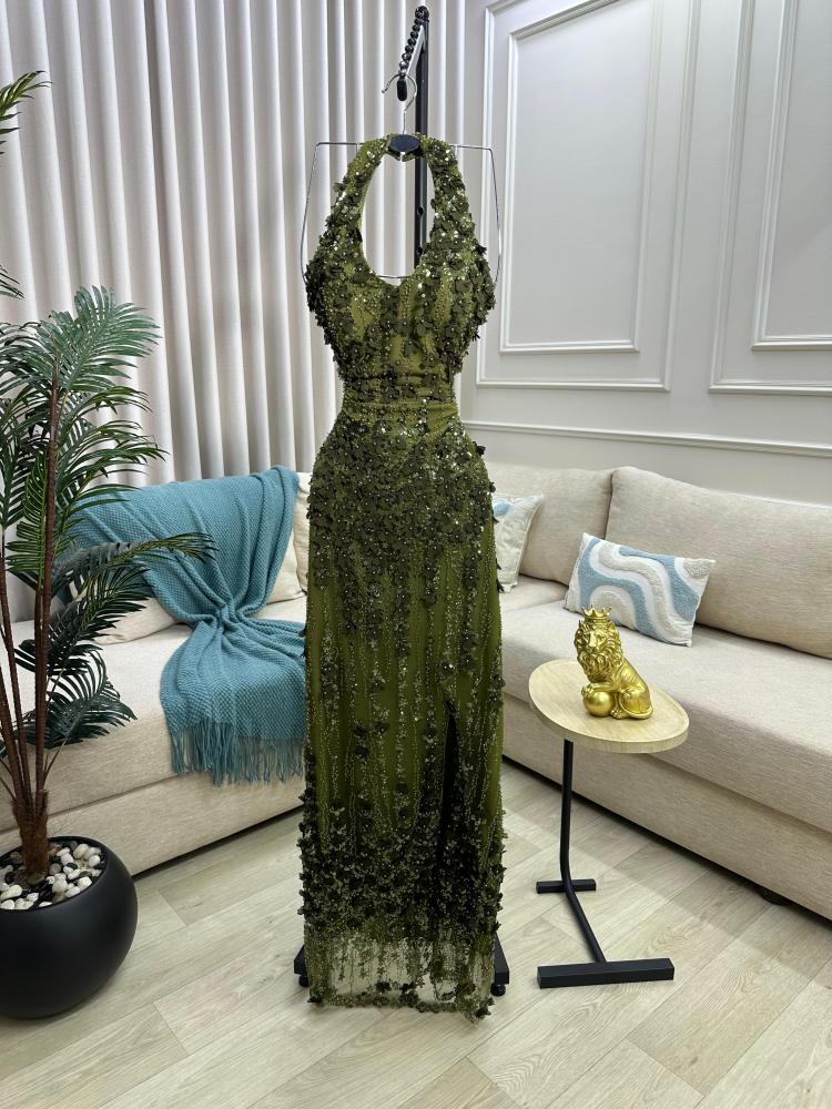 فستان سهرة طويل ضيق، باللون الأخضر الزيتوني الداكن، ينسدل بقصة عمودية تبرز القوام، مع فتحة جانبية تصل إلى الفخذ. يتميز الفستان بياقة هولتر (Halter neck) مرتفعة ومفتوحة عند الكتفين. يغطي الفستان بالكامل تطريز كثيف وموزع بنمط متدرج ومتقاطع من الترتر والخيوط اللامعة، خاصة في منطقة الصدر والخصر والأجزاء السفلية. الخصر محدد بحزام رفيع مدمج ومطرز.