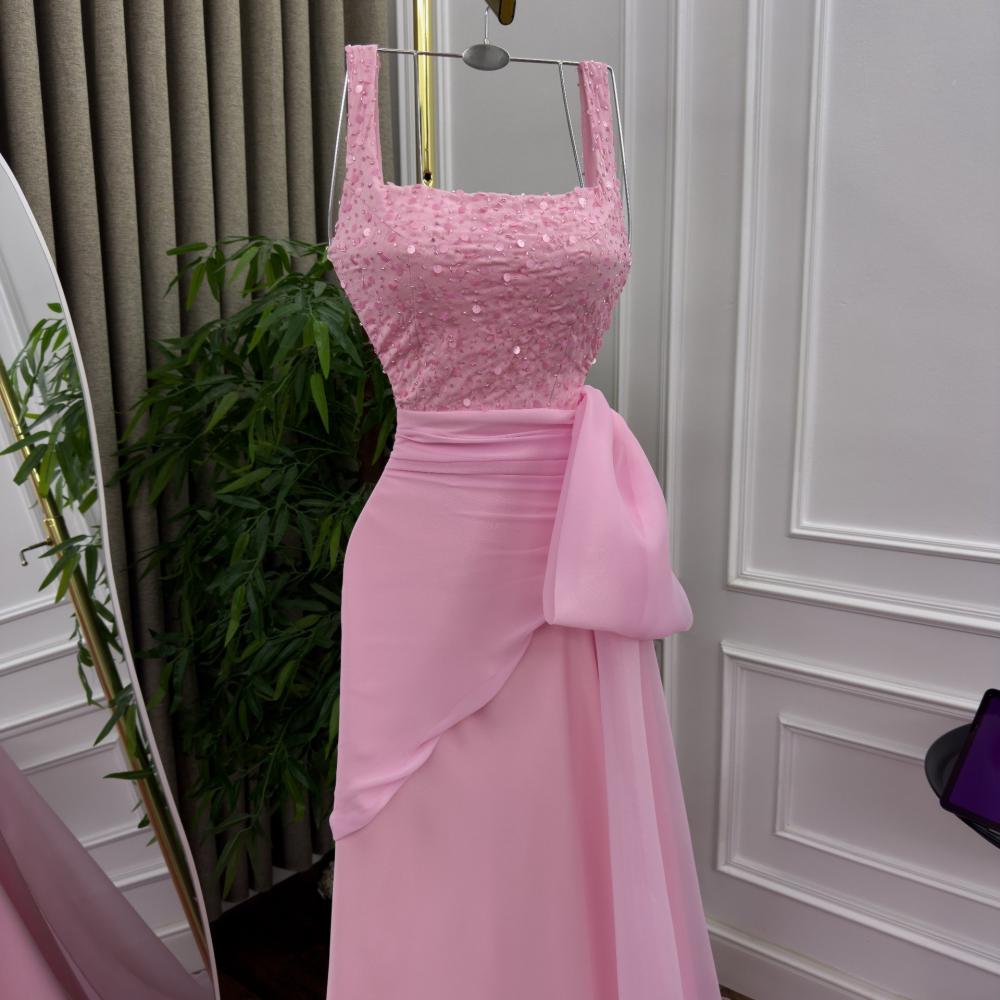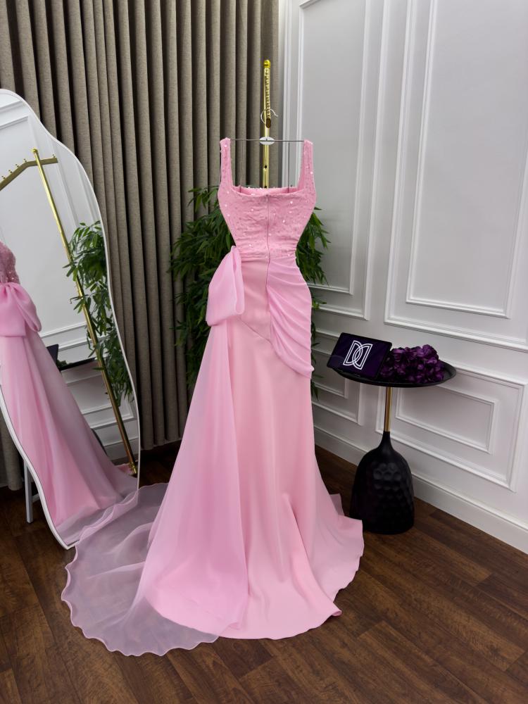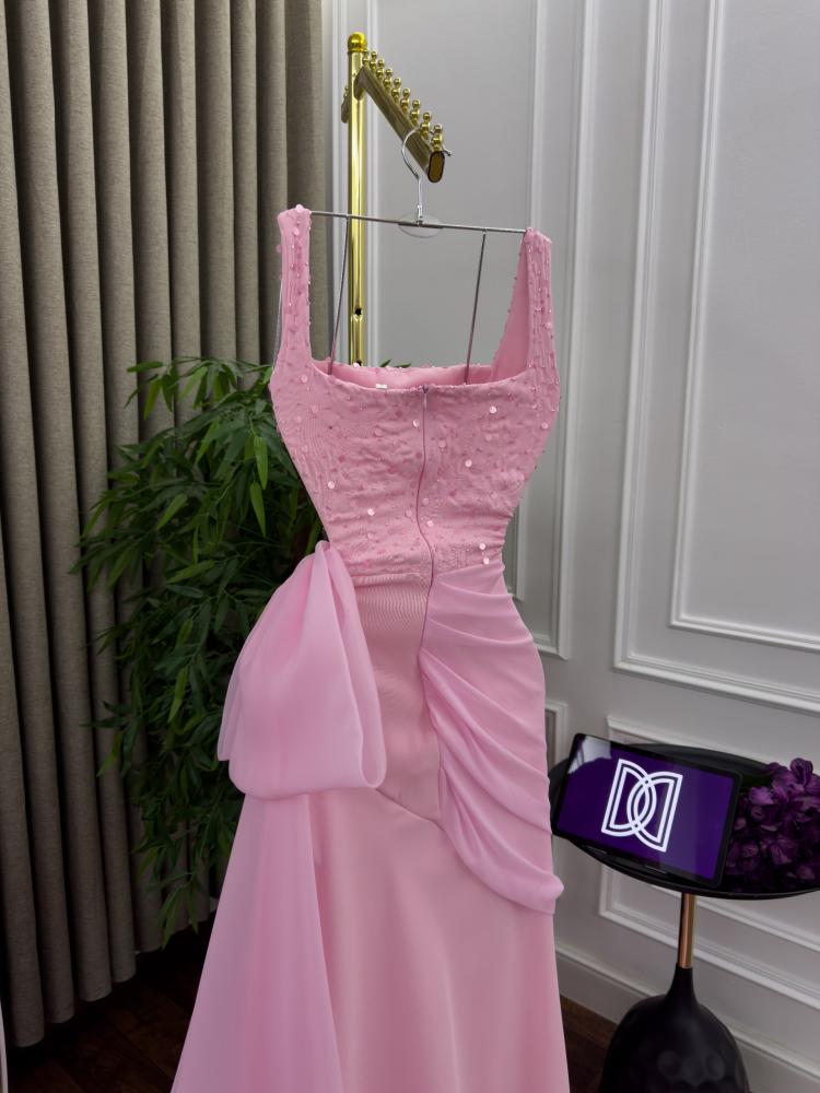 الفستان طويل وبلون وردي فاتح (بيبي روز). الجزء العلوي منه، من الصدر حتى الخصر، مغطى بالكامل بالترتر اللامع بنفس اللون الوردي، مما يضفي عليه لمعانًا وبريقًا. يتميز الجزء العلوي أيضًا بقصة مربعة عند الصدر وحمالات كتف عريضة نسبيًا.