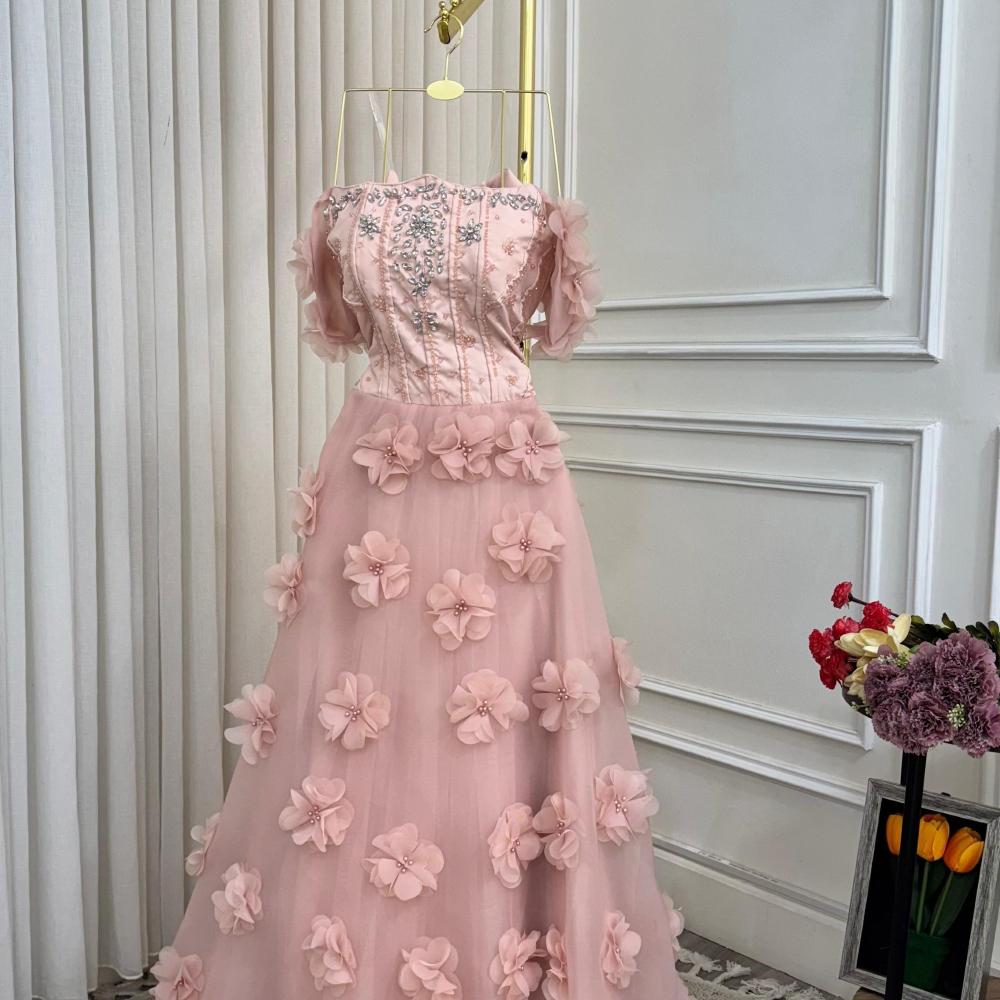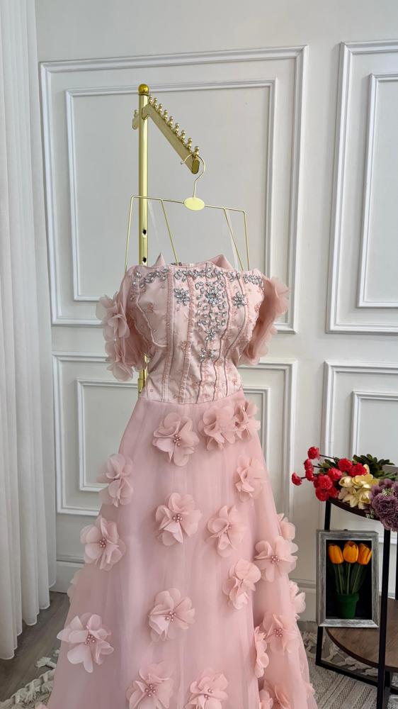 * الجزء السفلي (التنورة): واسع ومنفوش جداً، مصنوع من طبقات من القماش الشفاف مثل التل أو الأورجانزا. الميزة الأبرز في التنورة هي الزخارف البارزة على شكل "بتلات" أو "أزهار" ثلاثية الأبعاد منتشرة بشكل عشوائي على طول التنورة، مما يضيف لها حجماً وملمساً فريداً.