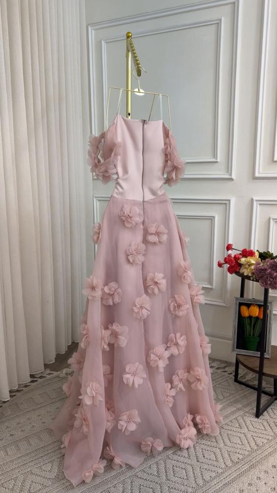الفستان وردي فاتح (أو زهري فاتح) طويل وواسع فستان سهرة أو مناسبات خاصة. يتميز بالآتي: