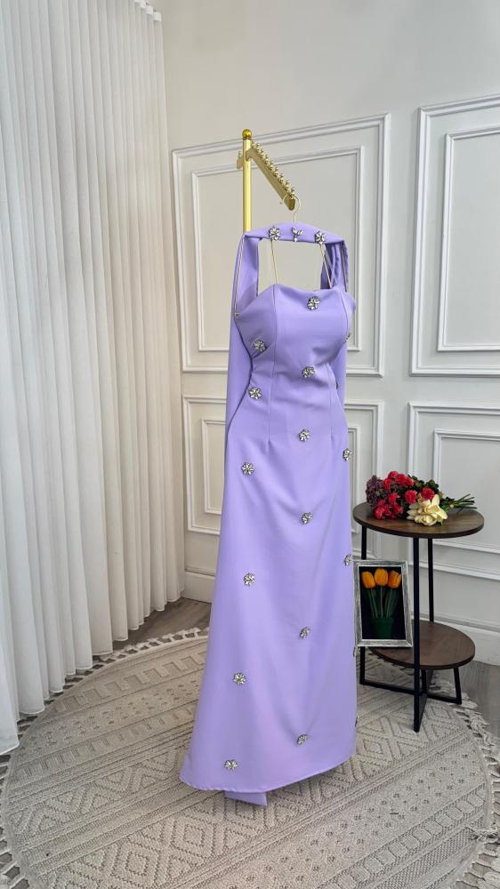 الفستان طويل، يصل إلى الأرض، ولونه بنفسجي فاتح أو ليلكي. يتميز بقصة مستقيمة أو عمودية إلى حد ما. الفستان بدون أكمام، وله حمالات رفيعة على الكتفين. الجزء العلوي منه يبدو وكأنه بقصة صدر مستقيمة أو على شكل قلب خفيف.