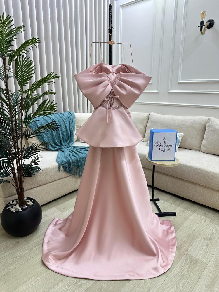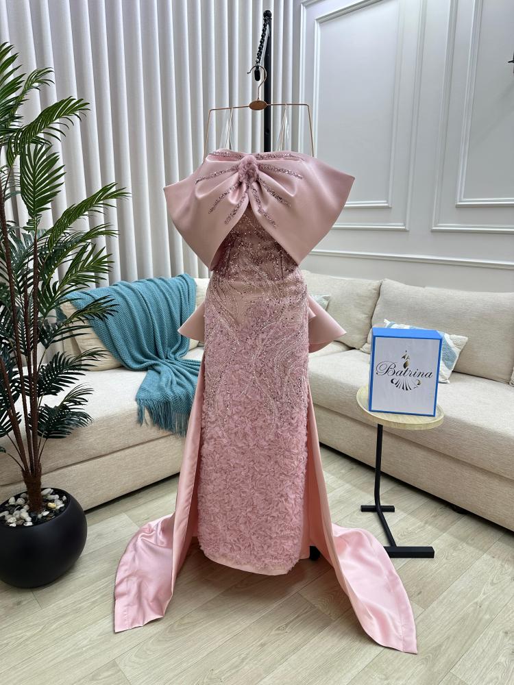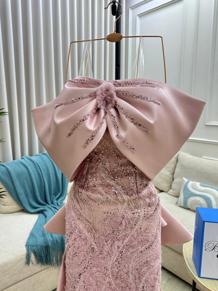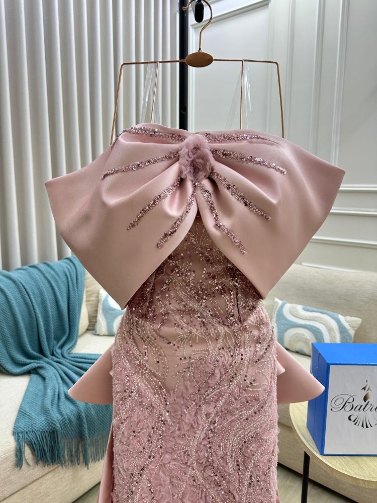 الفستان طويل ولونه وردي فاتح، ويتميز بتصميم فريد وملفت للنظر يجعله مناسباً للمناسبات الفاخرة والسهرات.